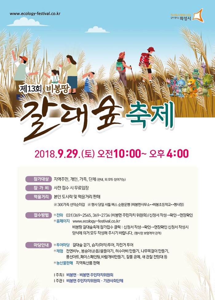 참가신청은 행사 홈페이지(www.ecology-festival.co.kr) 접수나 비봉면 주민자치위원회(031-369-2545, 3484)로 전화하면 된다.