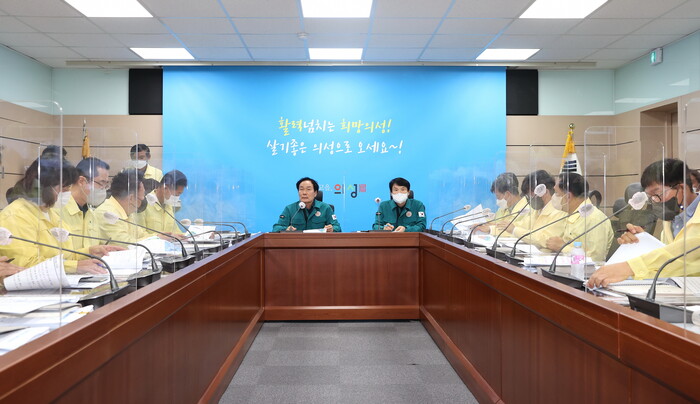 [로컬세계=박상진 기자]경북 의성군은 제11호 태풍 ‘힌남노’의 영향으로부터 ‘군민의 생명과 안전’ 수호를 위해 관‧단‧과‧소장 및 읍면장으로부터 분야별 태풍 대비 대처상황 보고를 받고 미비점에 대한 대책 마련을 위해 4일 오후 군청 회의실에서 긴급 대책회의를 개최했다.
