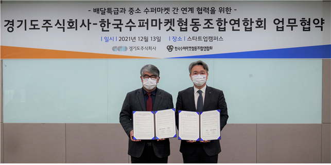 경기도주식회사는 13일 성남 판교 스타트업캠퍼스에서 한국수퍼마켓협동조합연합회와 '배달특급과 중소 수퍼마켓 간 연계 협력을 위한 업무협약'을 체결했다고 밝혔다.