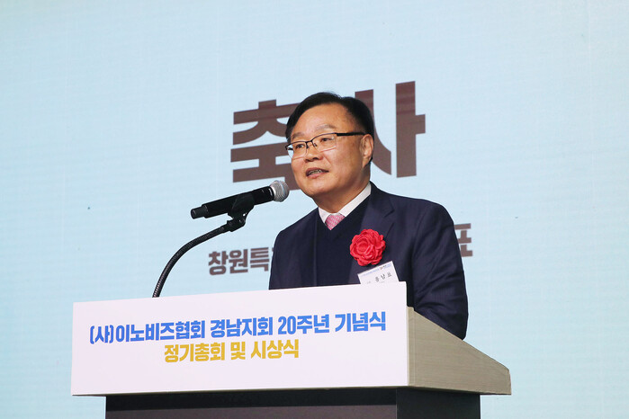 ▲ ★홍남표 창원특례시장이 이노비즈협회 경남지회 창립 20주년 기념식 참석해 축사를 하고 있다. 창원시 제공 |