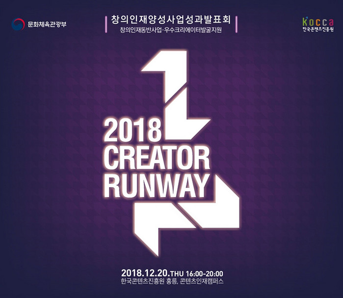 문화체육관광부와 한국콘텐츠진흥원은 이달 20일 서울 동대문구 홍릉에 위치한 콘텐츠인재캠퍼스에서 창의인재 양성사업 성과발표회 ‘2018 크리에이터 런웨이’를 개최한다.