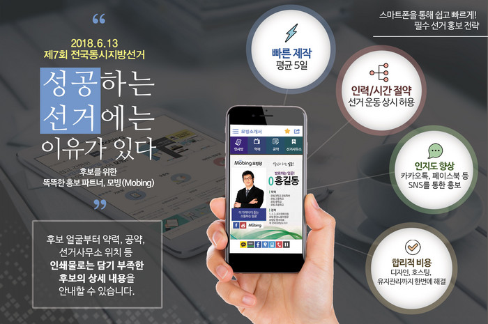모빙은 4차산업혁명시대에 쉽고 간편한 6.13 지방선거 전략으로 SNS 모바일 홍보공간 온라인 시장 변화에 따른 최신 기능을 지속적으로 업데이트가 가능하며 SNS를 통한 간편한 전송으로 배포 통계 시스템이 가동되는 카카오톡, 페이스북, URL 등 시간별 접속자의 통계가 이루어져 후보자에 대한 관심층을 매 순간 확인할 수 있다.